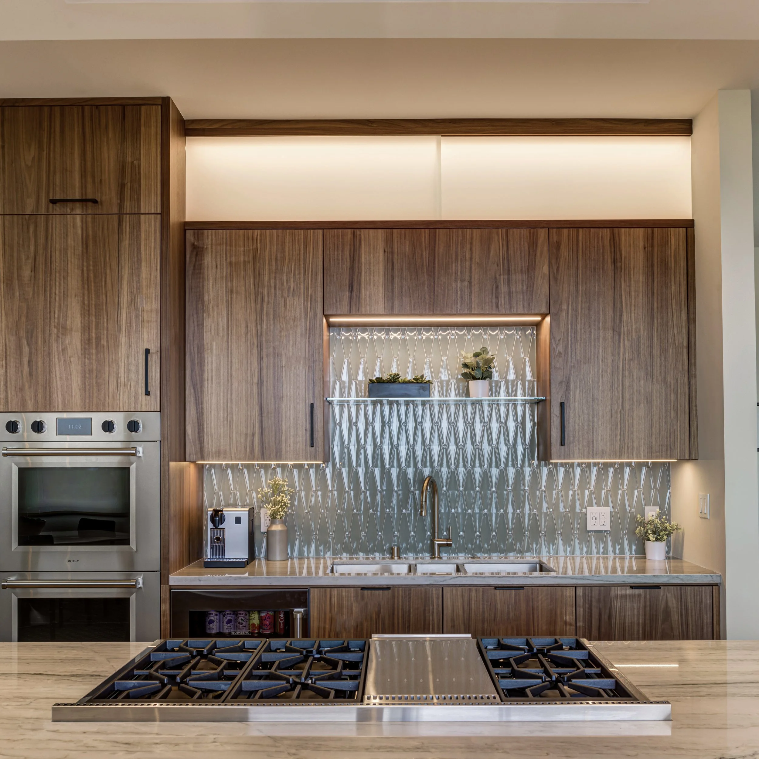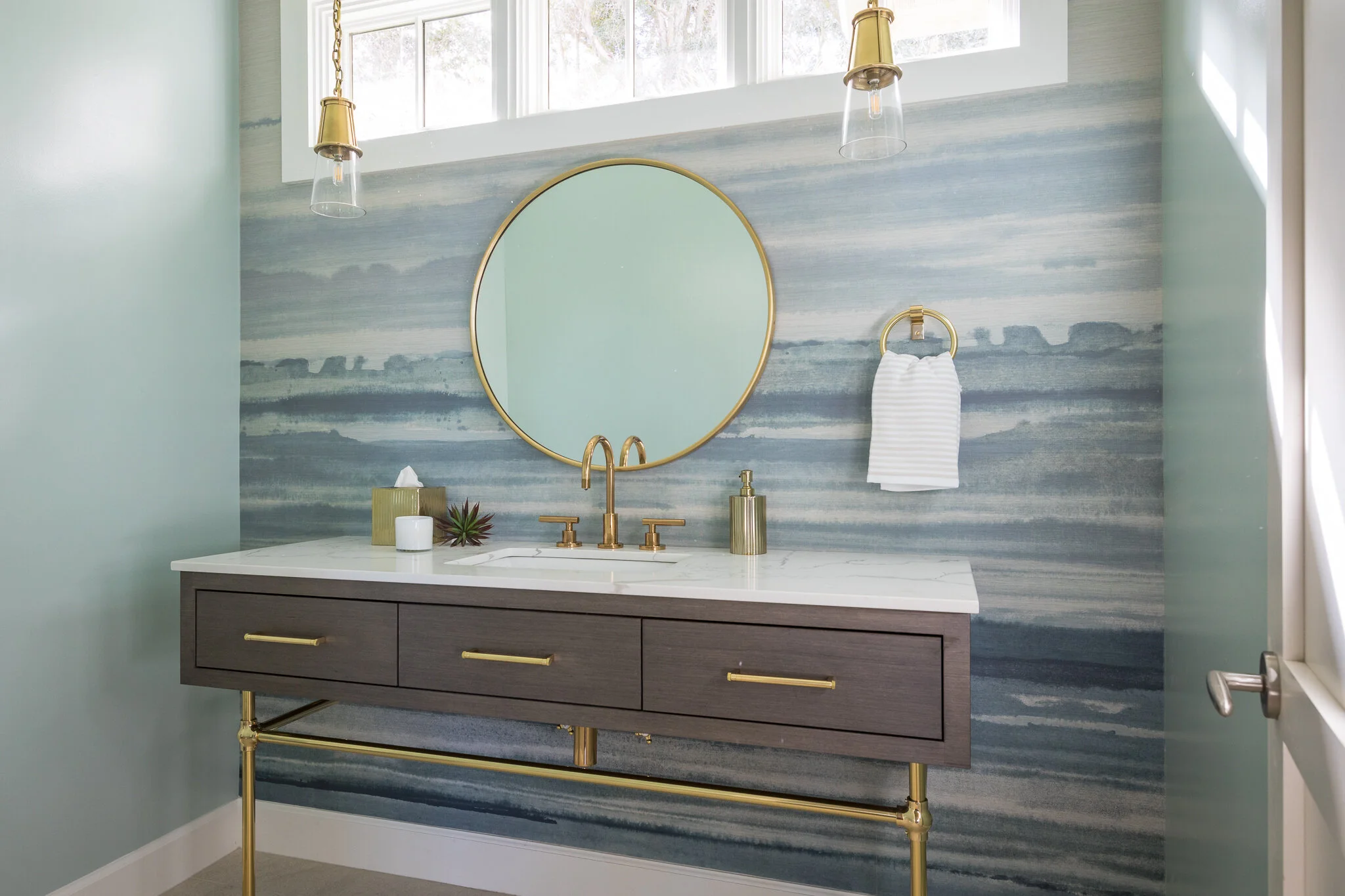 Throughout the design process, we have remained steadfast in our commitment to honoring the natural splendor that surrounds this home. The powder room is a charming homage to the seaside, while a custom preserved moss wall hanging in the breakfast nook pays tribute to the verdant greenery that envelops the property. The gray tones in the wood veneer of the custom casework evoke the misty ambiance of a San Francisco day.
